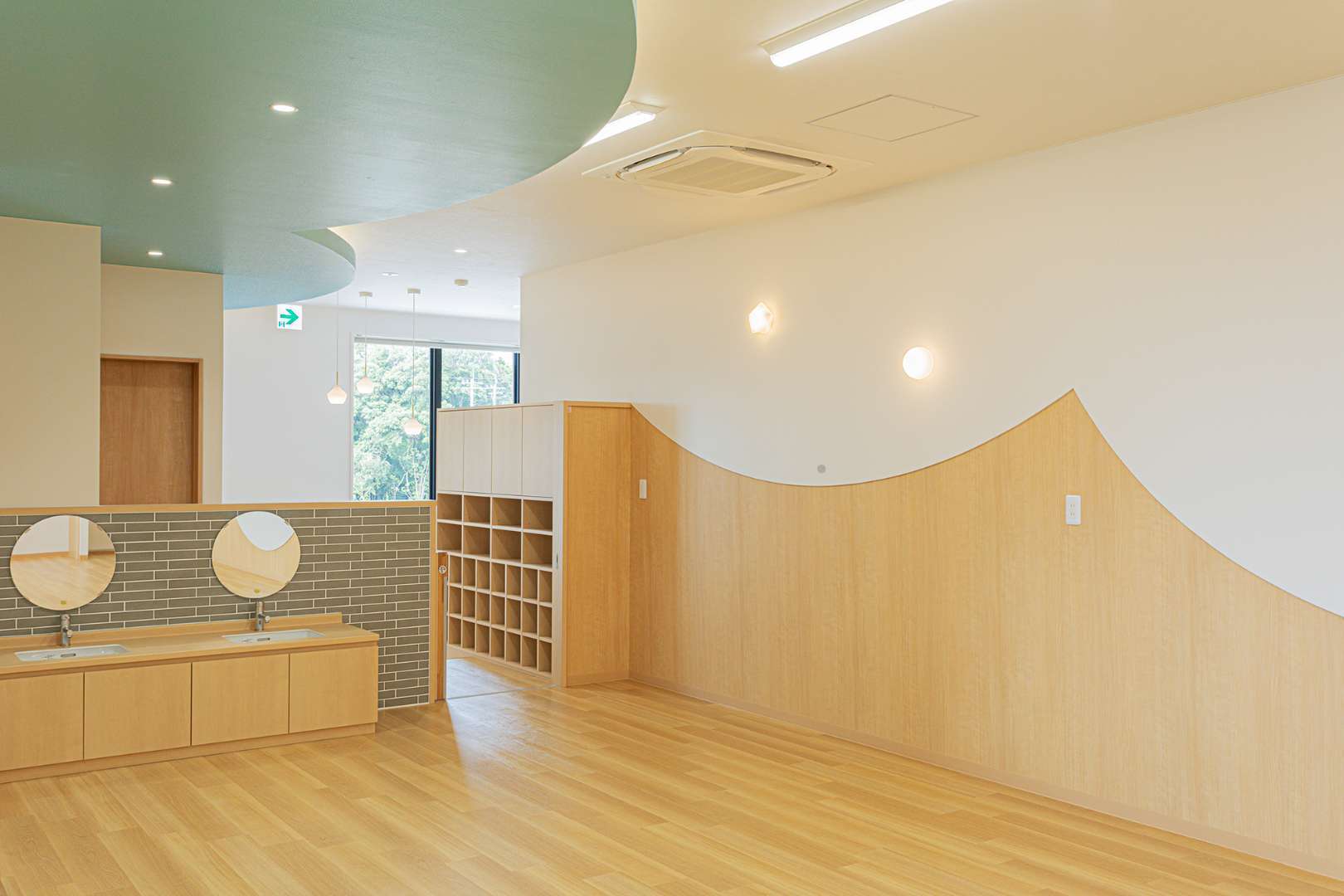 園児の安全を第一に考え、角のない家具やクッション性のある床材などを取り入れています。また、自然光や通風を活かし、明るく心地よい空間に仕上げる工夫も行っています。保育士が見渡しやすく動きやすいレイアウトにより、保育の質を保ちながら安心できる環境を整えます。